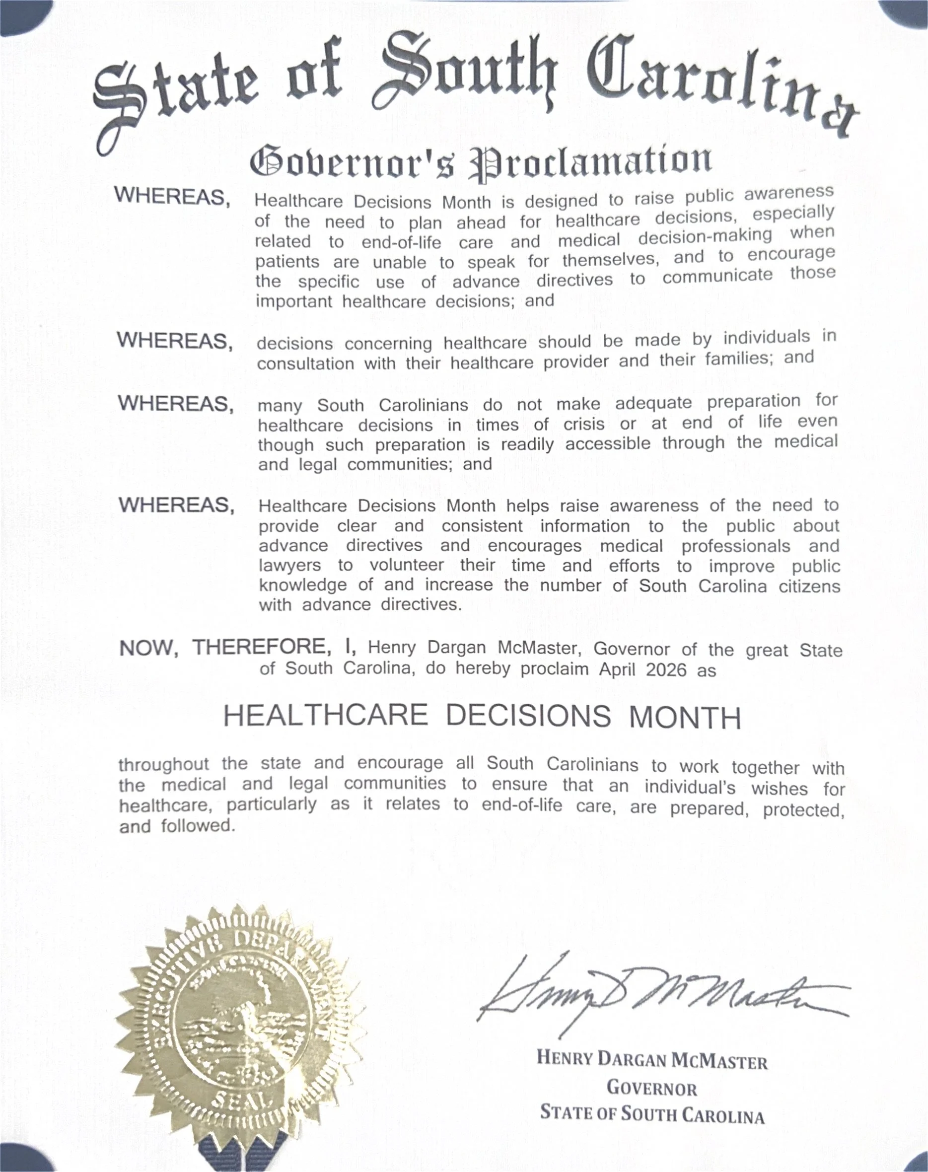 Now it’s time to decide who will speak for you if you are unable to speak for yourself. Write it down in a South Carolina Health Care Power of Attorney form. Share this document with your loved ones and your doctors.